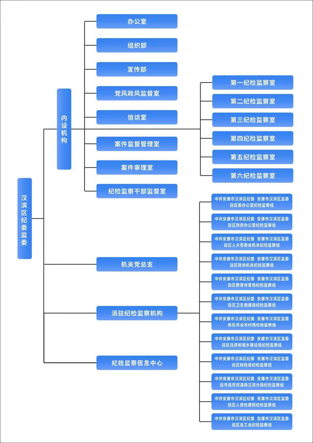 汉滨区纪委监委机关设办公室、组织部、宣传部、党风政风监督室、信访室、案件监督管理室、第一至第六纪检监察室、案件审理室、纪检监察干部监督室共14个内设机构和机关党总支。区委巡察工作领导小组办公室设在区纪委。此外,设有区纪检监察信息中心和派驻纪检监察组。